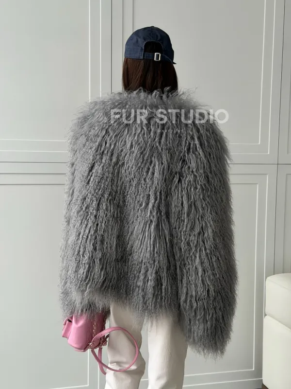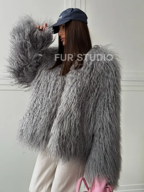 Серая шуба из натурального меха ламы 102811